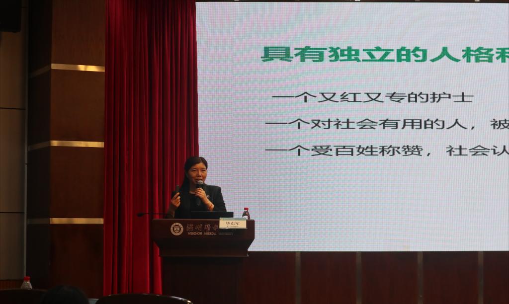 讲坛伊始,毕东军副经理为同学们介绍了台州恩泽医疗中心(集团)的组成与设置、使命与愿景,阐述了医疗中心始终秉持着的“十大信条”与精神文化。她围绕“何为有思想”“如何成为一个有思想的护理人”两大方面,展开了精彩的讲述。
