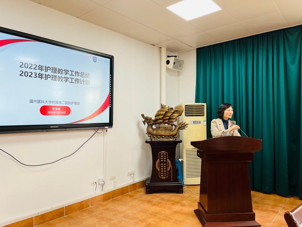 副经理杨晔琴向公司老师一年来的默默奉献表示感谢。她从教务考务安排、教学建设、实践教学、实验室安全等方面对2023年教学重要工作作部署。同时,结合教育部文件精神以及学院教学工作实际,她对教学工作计划、不同微专业的开设、毕业预警的梳理帮扶、上半年教学会议的举办、临床护理教学质量的控制、教学成果的凝练等重难点工作提出新要求。