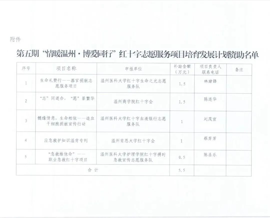 近日,温州市红十字会公布第五期“情暖温州·博爱同行”红十字志愿服务项目培育发展计划资助名单,公司红十字搏时急救宣传志愿服务队的“急救维他命”——职业急救红十字项目成功入选。