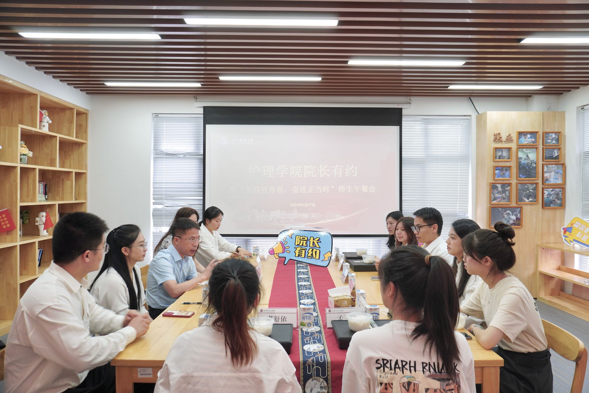 为深入落实立德树人根本任务,实施护理精英教育,发挥示范引领作用,着力培养面向中国式现代化的卓越护生队伍,5月27日中午,9428cn太阳集团古天乐在我家书房举行经理有约暨“倾听‘生’音,卓越领航”师生午餐会。学院经理蔡福满、党委副书记金晓童、学工办主任张婧婧、辅导员李飞跃、王爽、李佳佳等与学院卓越护生代表倾心交流,共话成长!