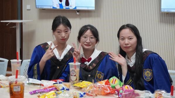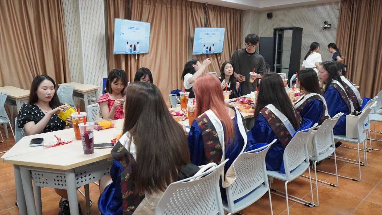 联欢会现场气氛轻松欢快,研究生会的同学们精心策划了多个互动环节。在温馨的切蛋糕仪式上,辅导员王国超和班长傅莹洁为毕业生们点亮蜡烛,分发纪念蛋糕,香甜的奶油传递着同窗情谊。随后的游戏环节热闹非凡,“谁是贪吃鬼”“传声筒”等趣味游戏让现场笑声不断,同学们在互动中展现出十足的默契。