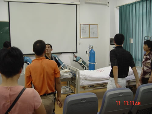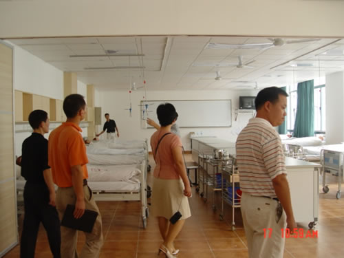 陈行汉副书记向客人们介绍了学校和学院的办学历史,护理专业的发展情况。学院办公室王世泽老师向客人们详细汇报了学院的人才招聘、团队建设、人才培养、实验室建设、教学管理和实习基地建设等有关方面情况。朱卫民经理也向我们简单介绍了广西医科大学9428cn太阳集团古天乐的教学、科研和人才培养情况。随后客人们参观了学院护理学基础、急救护理学、外科护理学、妇儿实验室和护理示教室,他们详细了解了实验室建设规划、布局等情况,对公司的实验室建设和教学管理工作大加赞赏。