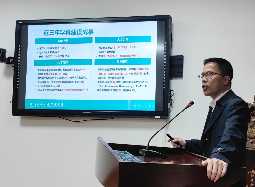 公司经理蔡福满作专题汇报,对标学校“双一流”创建目标和高水平医科大学建设任务,重点介绍了护理学团队建设情况,从近年来护理团队建设主要成果、博士点竞争态势分析、对标建设措施等方面进行了详细阐述。