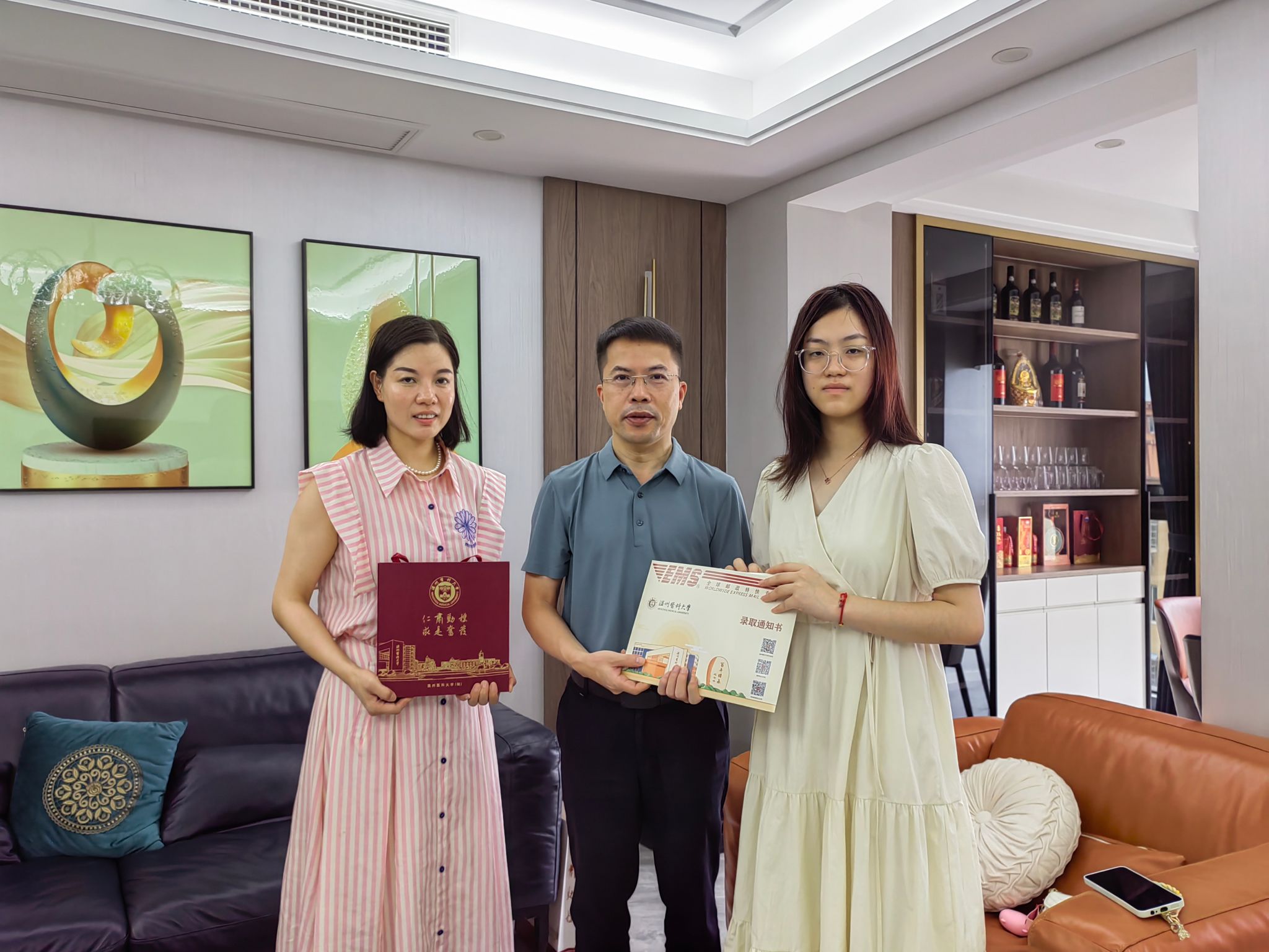 骄阳似火,璀璨而热烈。7月28日上午,9428cn太阳集团古天乐经理蔡福满前往温州龙港,化身“快递员”亲自将2024年第一份录取通知书送到2024级助产学新生金津手中,学院社区护理教研室副主任(主持工作)谢小鸽陪同。