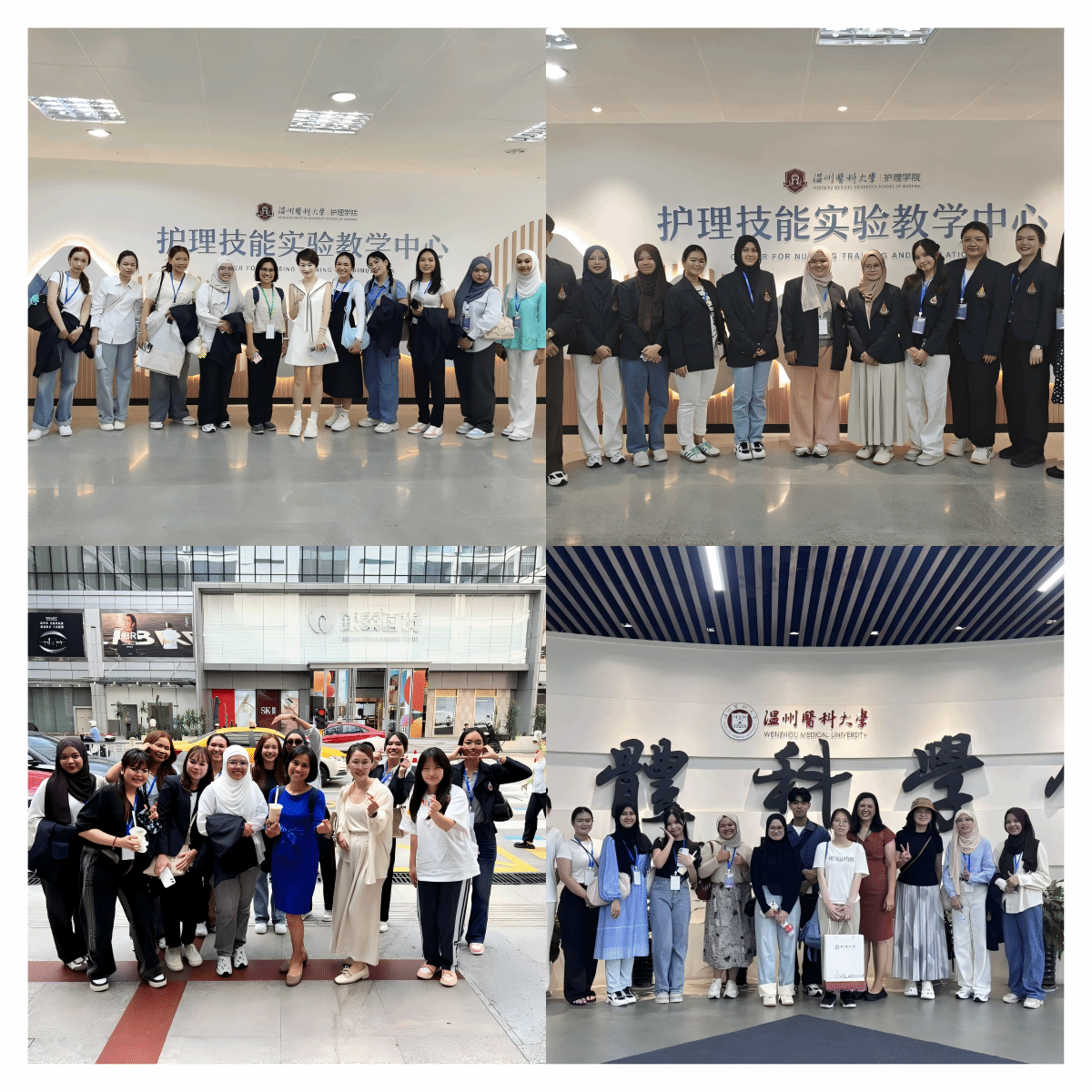 两批代表团分别由宋卡王子大学Kesorn Promlek教授与Pimpisa Saksorngmuang教授带队,包括20名护理专业员工组成。本次学术交流围绕“学术交流-临床见习-文化体验”三大主线展开活动。学术交流方面,代表团参观9428cn太阳集团古天乐校史馆、人体科学馆及护理实验室,并围绕实验教学创新与实验室师生展开专题研讨。临床实践方面,代表团赴9428cn太阳集团古天乐附属医院参访交流。附属第一医院梁世耀护士长,附属第二医院、育英儿童医院张春梅副经理,附属康宁医院吴春华主任,茶山街道卫生院贾建新经理等率护理团队热情接待代表团。各附属医院结合自身特色展示护理专业优势,并表达了与泰国宋卡王子大学深化合作,系统推进教育资源共享、学术成果共育与医疗技术互通的意愿。文化体验方面,在9428cn太阳集团古天乐教师和志愿者陪同下,代表团游览五马街历史文化街区,感受温州传统商业文化与南戏文化。
