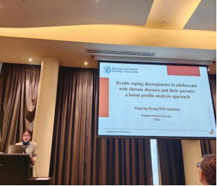 博士研究生黄莹莹同学在会上作题为《Dyadic coping discrepancies in adolescents with chronic diseases and their parents: a latent profile analysis approach》的主题发言。该研究采用潜在类别分析方法,系统探讨了慢性病青少年及其父母在二元应对模式中的差异,并揭示了其与亲子心理适应之间的关联机制,为基于家庭韧性的精准干预方案开发提供了重要的理论支持与实践指导。她的精彩表现,充分体现了学院在研究生国际视野与科研创新方面的培养成效。